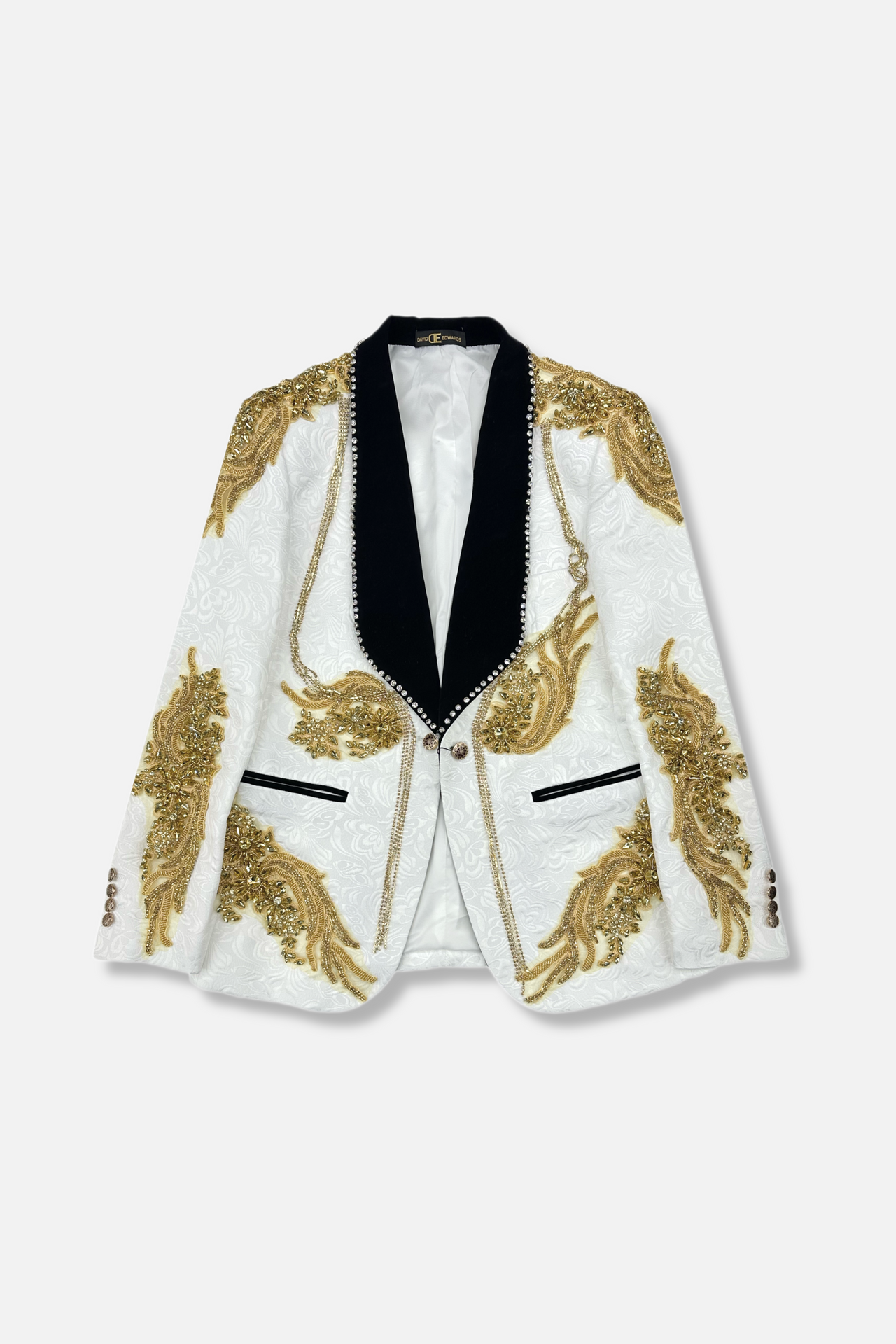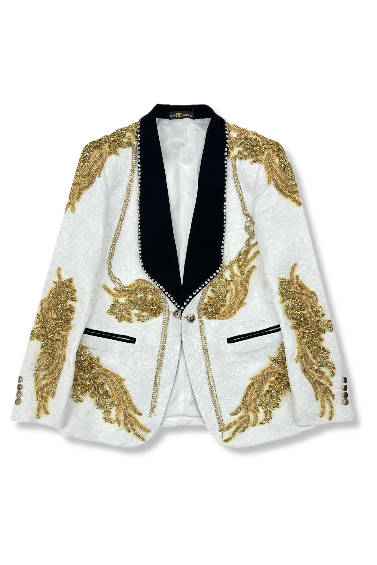 The Damiano Shawl Collar Tuxedo by David Edwards is a sophisticated men’s vested tuxedo featuring a sleek velvet shawl collar with rhinestones. A perfect blend of elegance and artistry for standout formalwear.